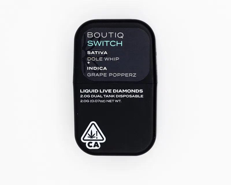 The BOUTIQ SWITCH V2 Dole Whip (Hybrid) x Grape Popperz (Sativa) is a high-performance dual-tank disposable vape designed for cannabis users seeking balanced effects, creativity, and focus. Available now at Boutiq Switch Official, this premium vape combines a hybrid and sativa strain in one sleek, portable device, delivering a customizable and versatile cannabis experience.